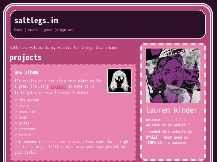 i'm gonna add more pages so all my stuff will be hosted at least once on my own server :D that means all my music, my art, my games, etc!